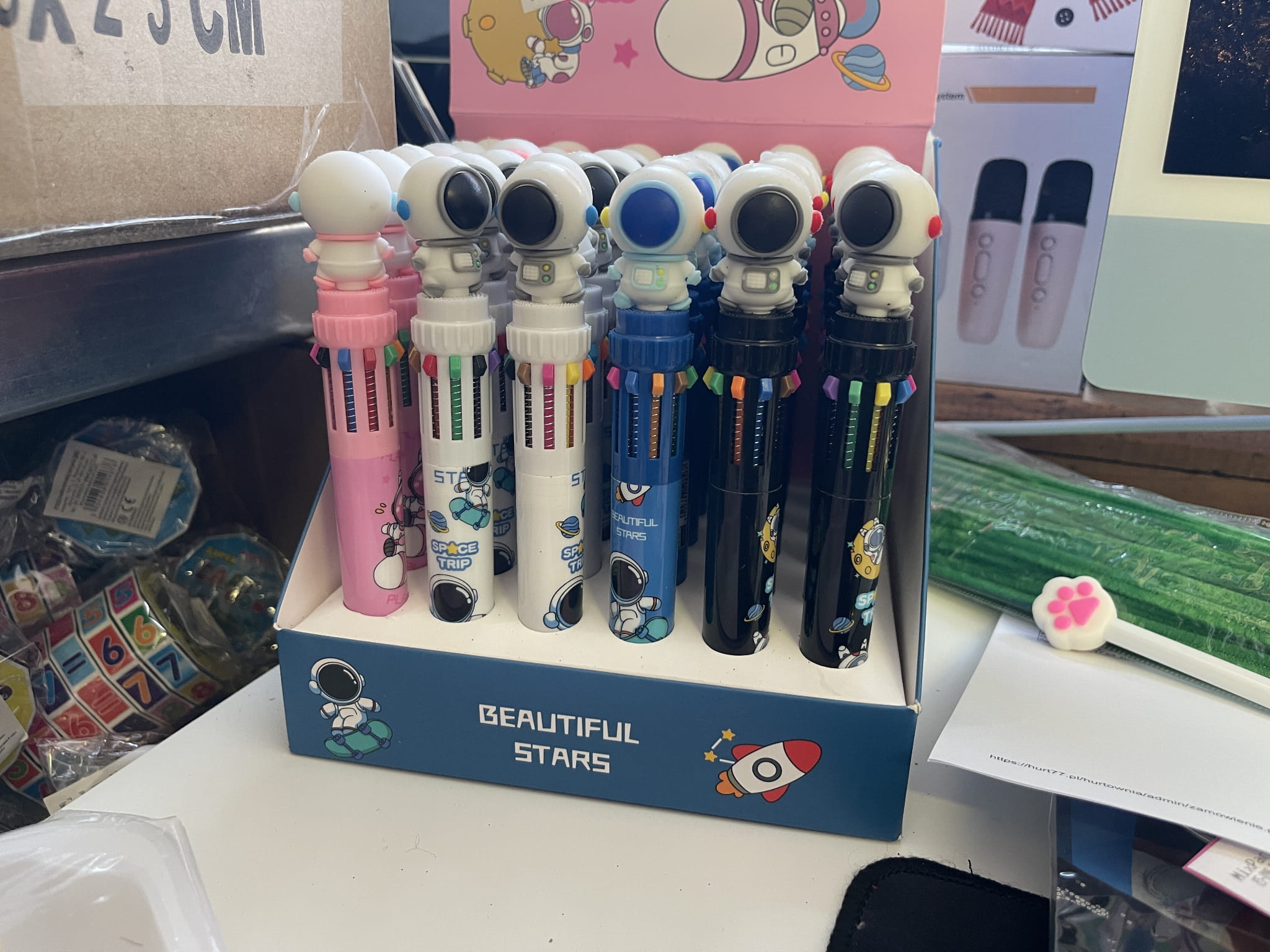 Praktyczny i efektowny długopis wielokolorowy z motywem kosmosu i uroczą figurką kosmonauty na górze. Idealny dla dzieci do szkoły, przedszkola lub do domowej zabawy w pisanie i rysowanie.