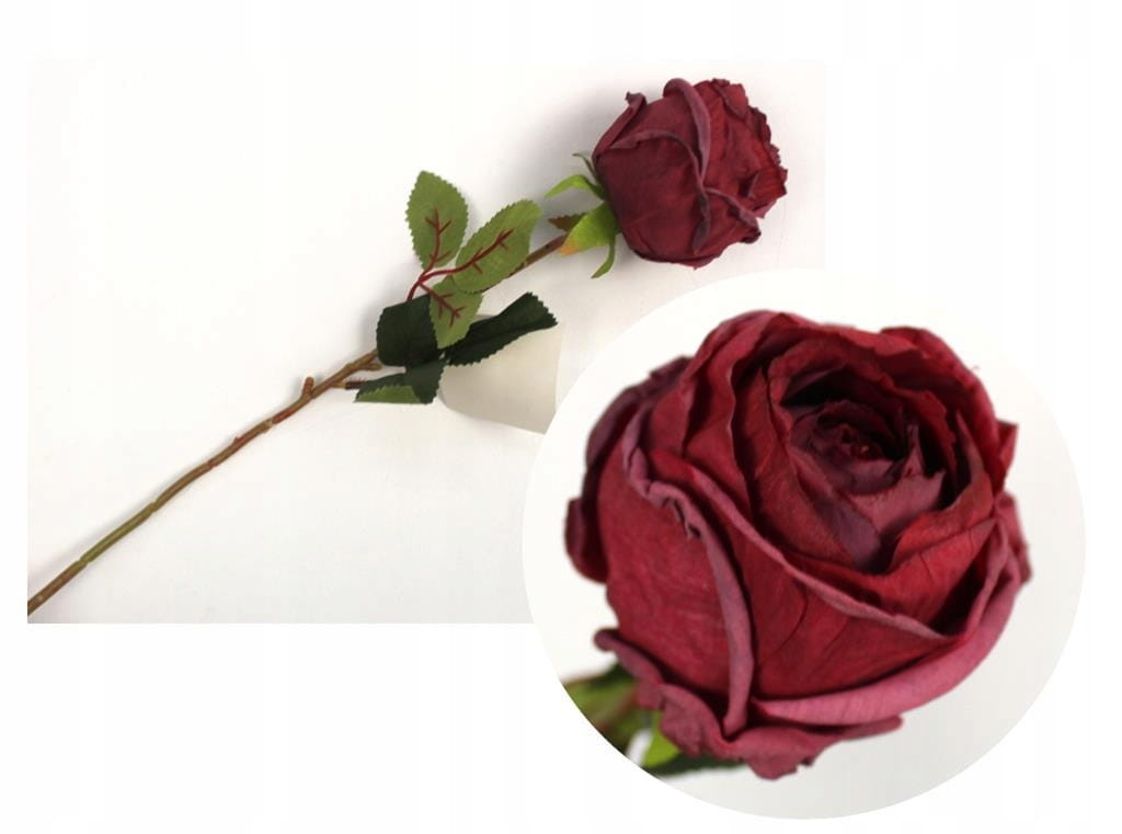 Kwiat pojedynczy RÓŻA podsuszana wys 42cm (główka 6,5x7cm) BORDOWA sztuczna