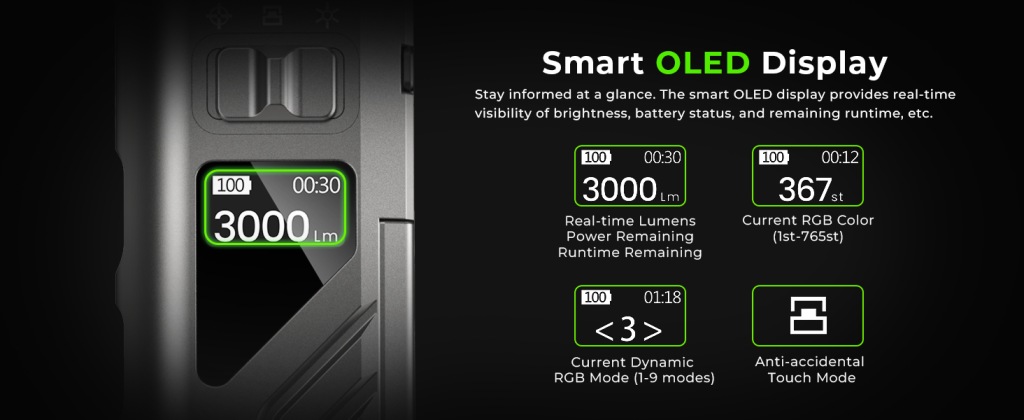 Inteligentny wyświetlacz OLED-bądź informowany na pierwszy rzut oka. Inteligentny ekran OLED zapewnia natychmiastowy wgląd w lumeny w czasie rzeczywistym, poziom baterii, pozostały czas działania itp.-dzięki czemu zawsze wiesz dokładnie, co robi Twoje światło, nawet w ciemności.