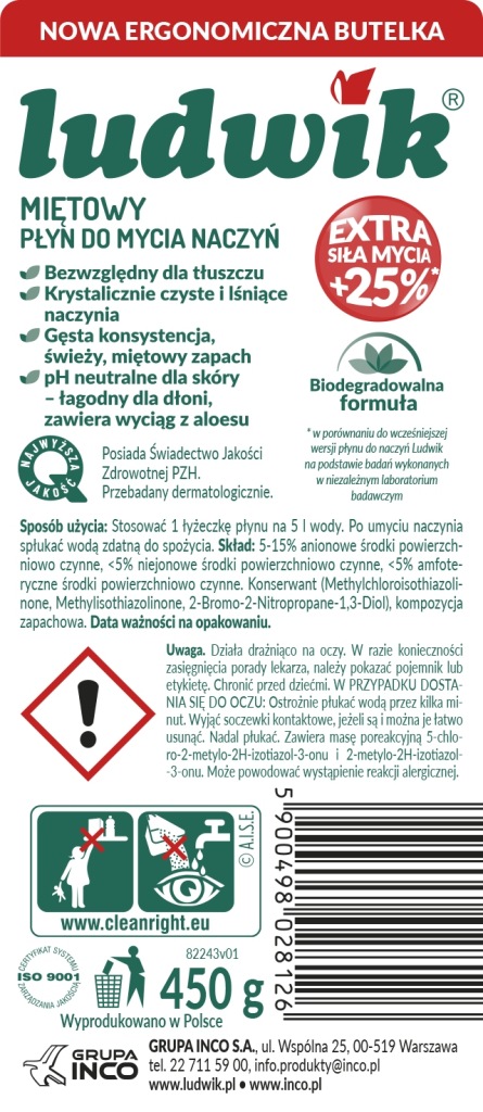 Ulepszona receptura produktu zapewnia o 25% większą siłę mycia w porównaniu do wcześniejszej wersji płynu do naczyń Ludwik. Dzięki temu, umyte naczynia są perfekcyjnie czyste i lśniące. Formuła płynu jest biodegradowalna, a zatem jest to produkt przyjazny środowisku.