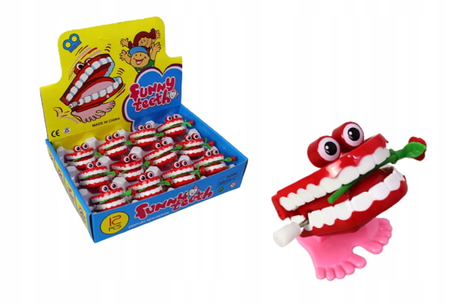 Klasyczna zabawka typu NAKRĘCANKA. Nakręcana zabawka przedstawiająca szczękę z oczami i różą. Nakręcana szczęka nie omieszka zgrzytać zębami! Szczęka po nakręceniu podskakuje na krótkich stópkach i przemieszcza się, otwierając buzię i wydając charakterystyczne dźwięki. Przy poruszaniu się wydaje dźwięk typowy dla nakręcanki.
