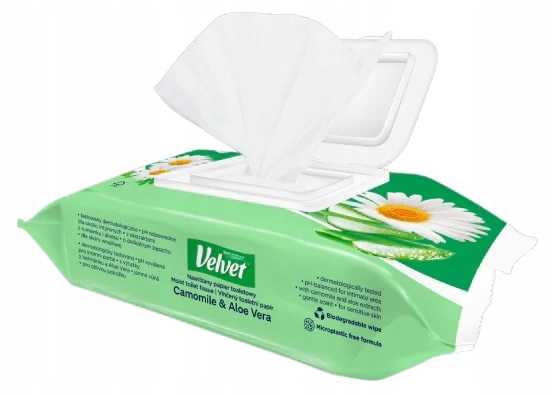Nawilżany papier toaletowy Velvet Camomile & Aloe Vera to doskonała pielęgnacja okolic intymnych oraz uzupełnienie codziennej higieny toaletowej dla każdego! Produkt przeznaczony jest dla skóry normalnej i wrażliwej.