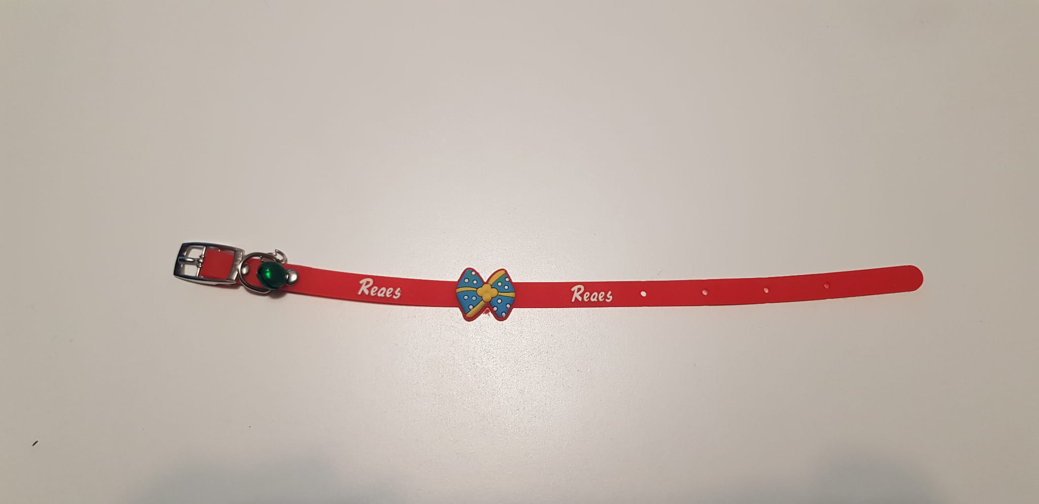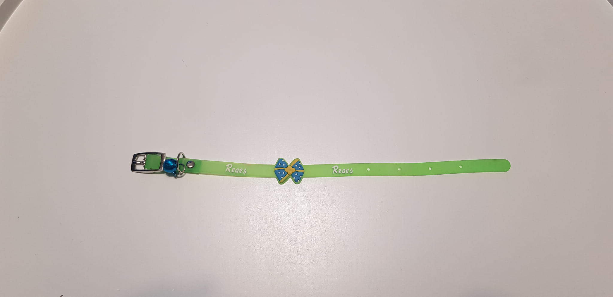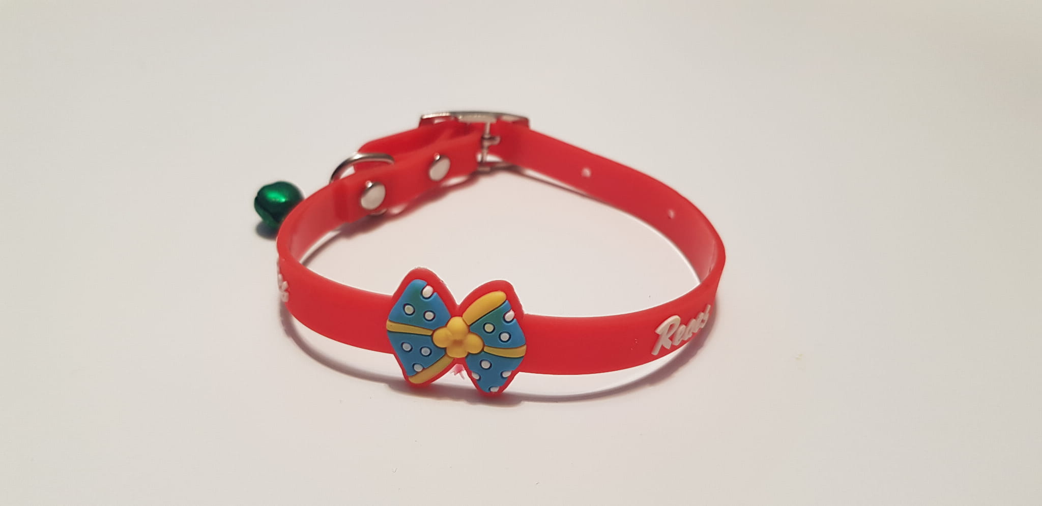 Delikatna, silikonowa obroża z kokardką i dzwoneczkiem, którą możemy samodzielnie zdjąć, poprzez wygięcie metalowego mocowania.