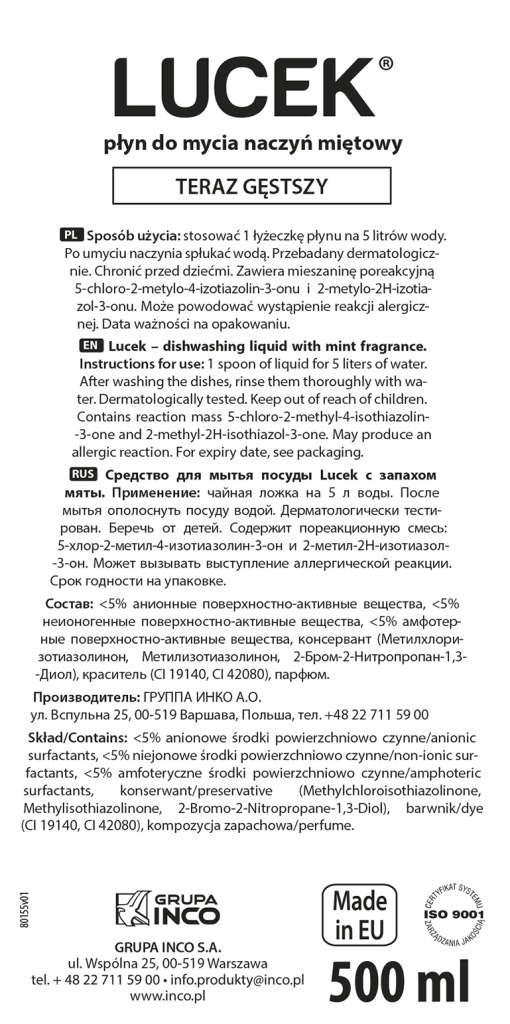 Płyn do mycia naczyń Lucek miętowy MINT 0,5 l Polska chemia