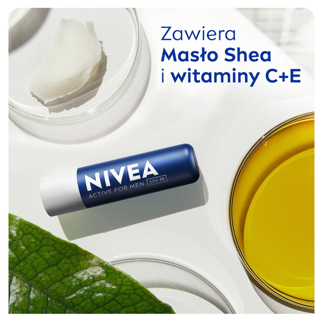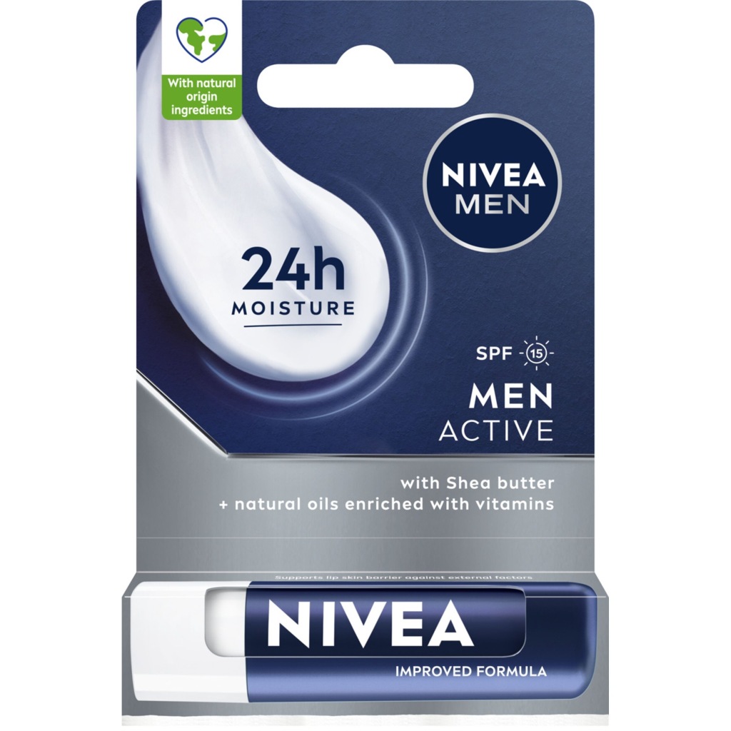 Zadbaj o swoje usta każdego dnia! Formuła pomadki dla mężczyzn NIVEA MEN Active natychmiast wtapia się w Twoje usta, zapewniając im 24-godzinne nawilżenie*. Pomadka NIVEA MEN ze składnikami pochodzenia naturalnego przynosi ukojenie oraz zapobiega suchym i spierzchniętym ustom u mężczyzny. Dodatkowo, filtr SPF 15 chroni wargi przed szkodliwym wpływem promieni słonecznych.
