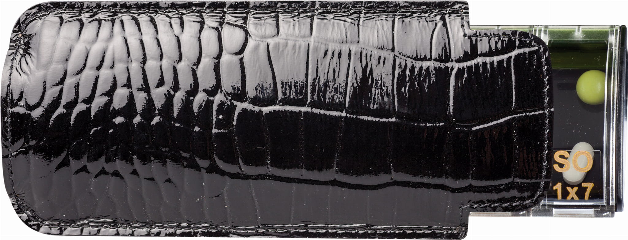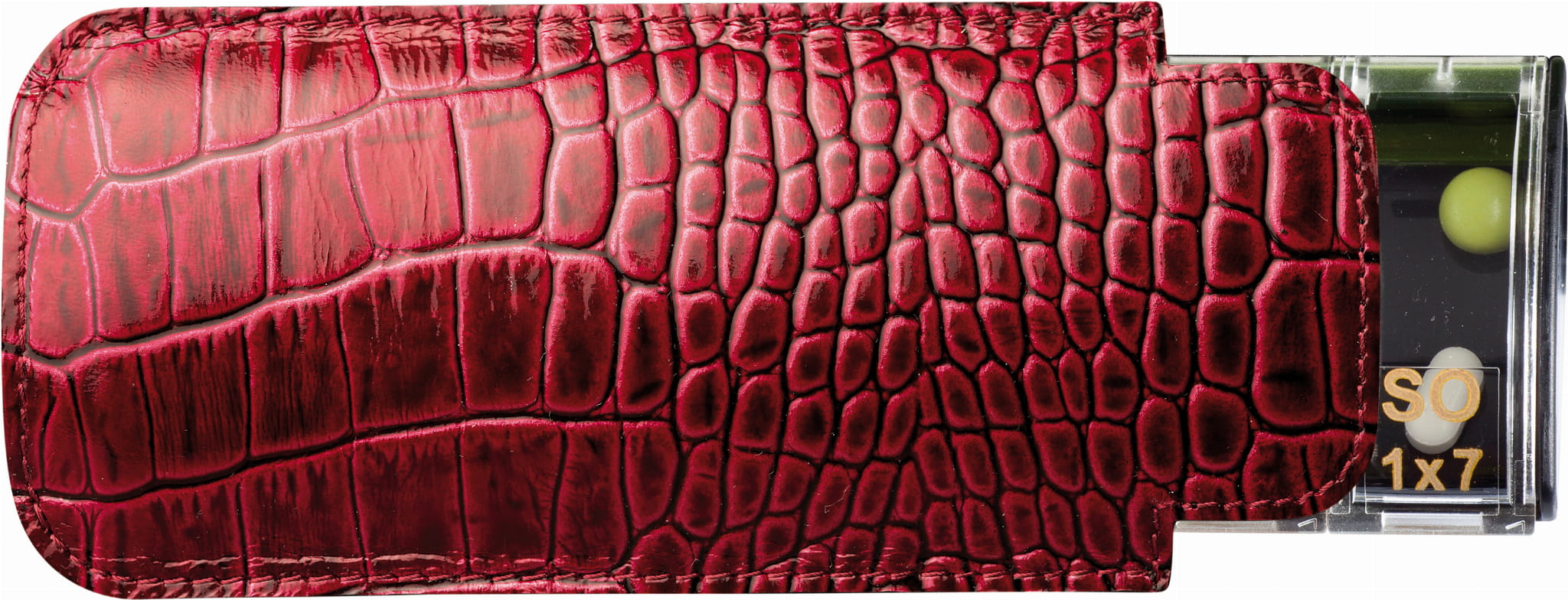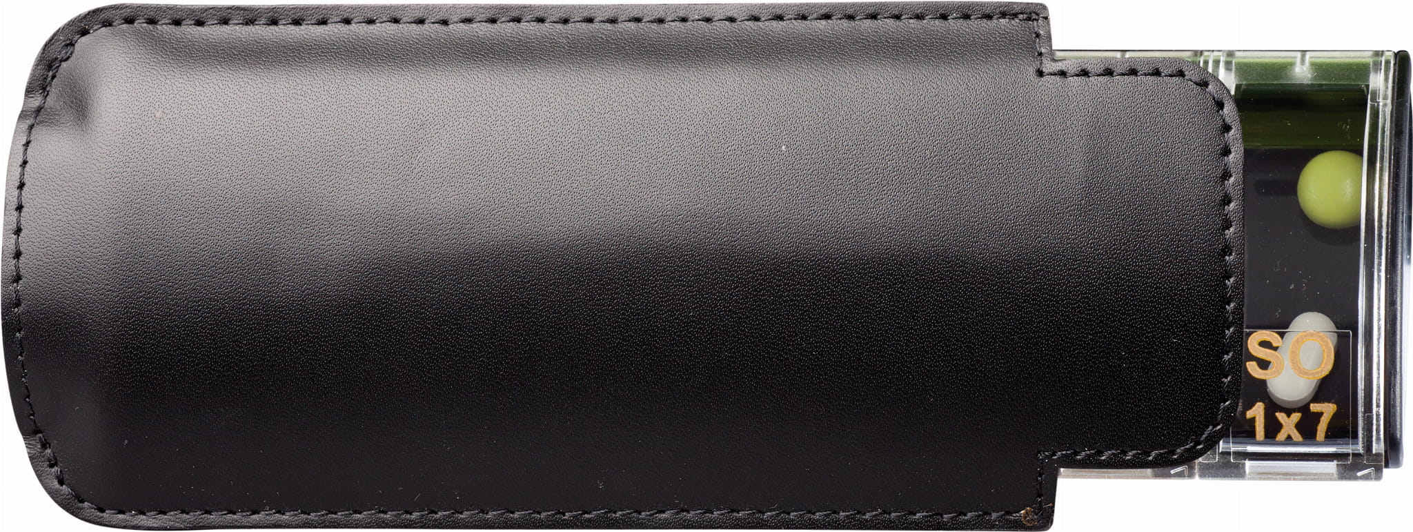 W zestawie znajduje się skórzane etui na przechowywanie pojemniczka.