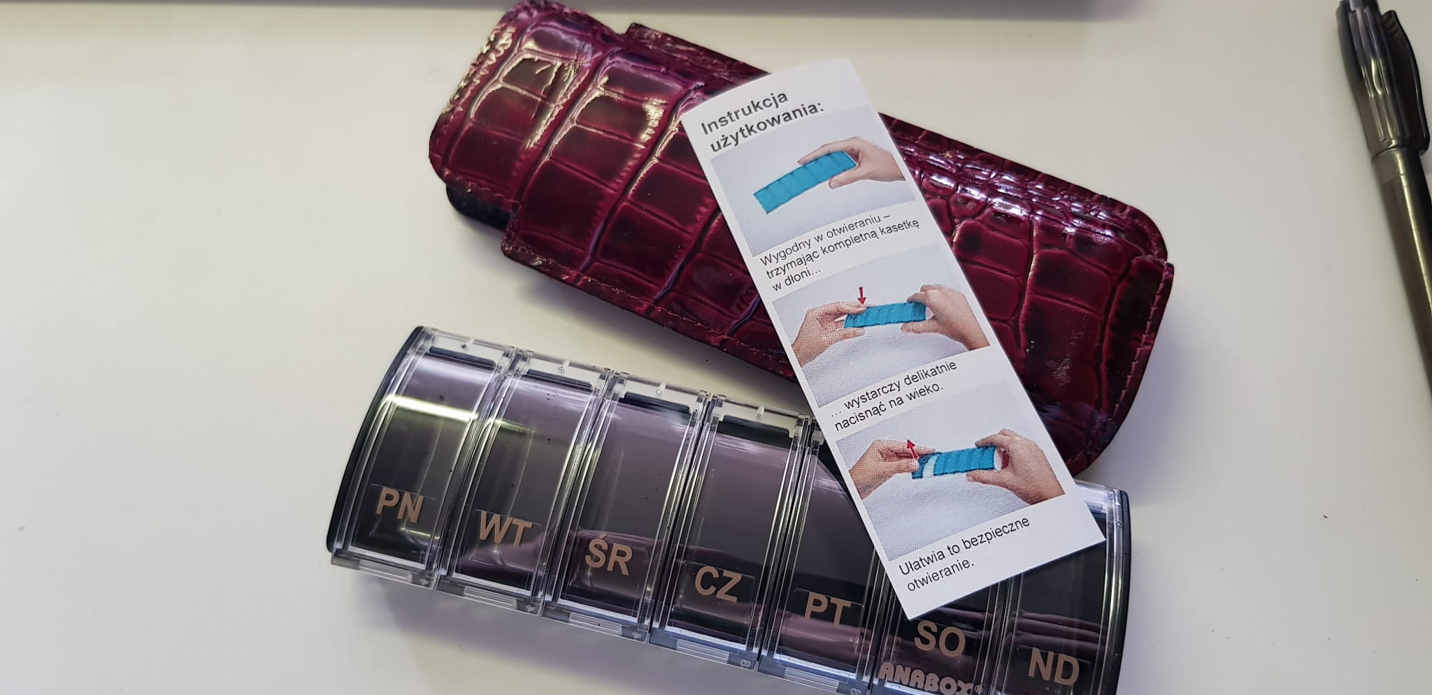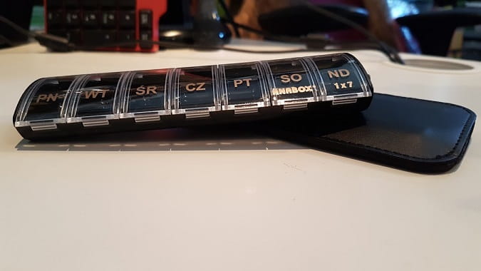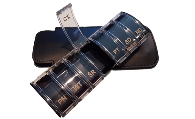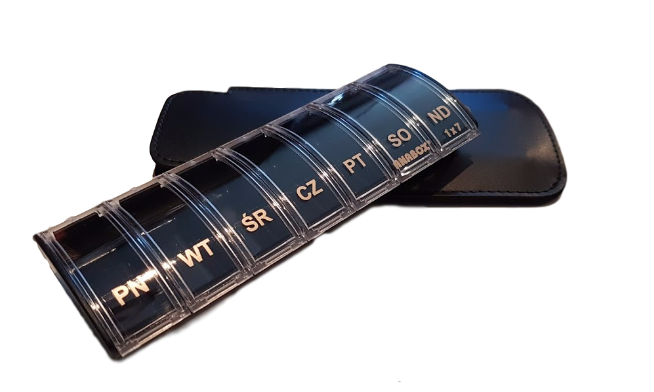 Pojemnik na siedem dawek, jedna codziennie. Otwierane i zamykane na zatrzask.